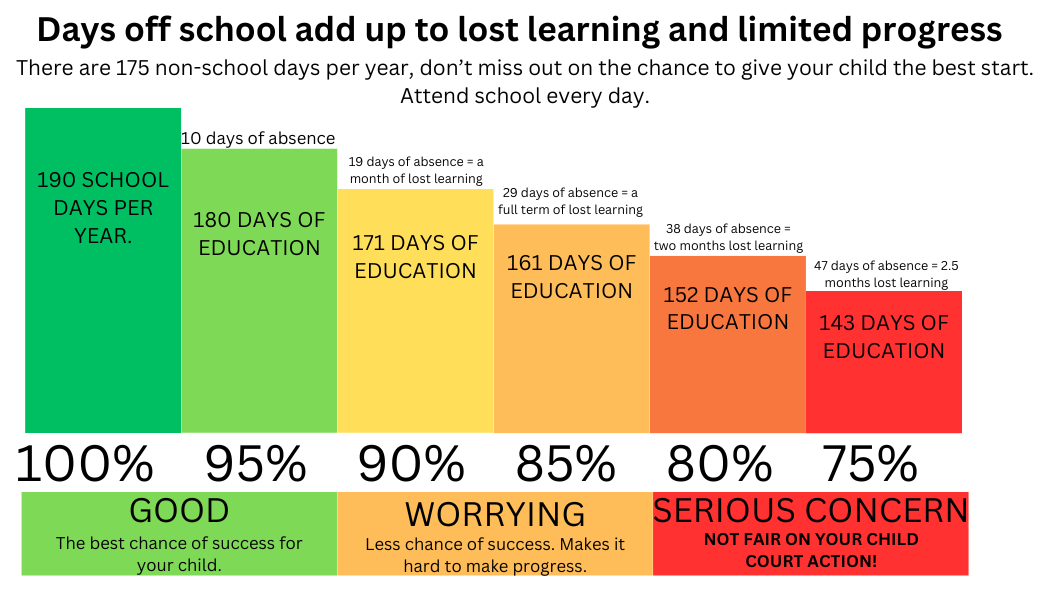 • An attendance record of 80% might seem acceptable but is equal to one day missed per week!! If this continues from Years 2 to 6 a total of one year’s education will be lost.